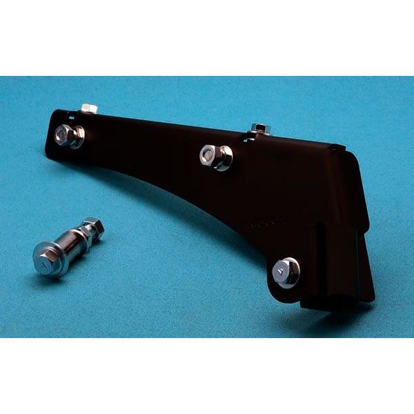JB23 43用。リアのフレーム側ラテラルロッド取付位置を、36mmダウン&後方に40mmオフセットさせるブラケット。リアラテラル補正ブラケット・との組合せで、3インチ(約75mm)アップ時の補正がノーマル時に近いラテラルロッド角度になる。装着時は穴あけ加工が必要。スチール製黒メッキ仕上げ。