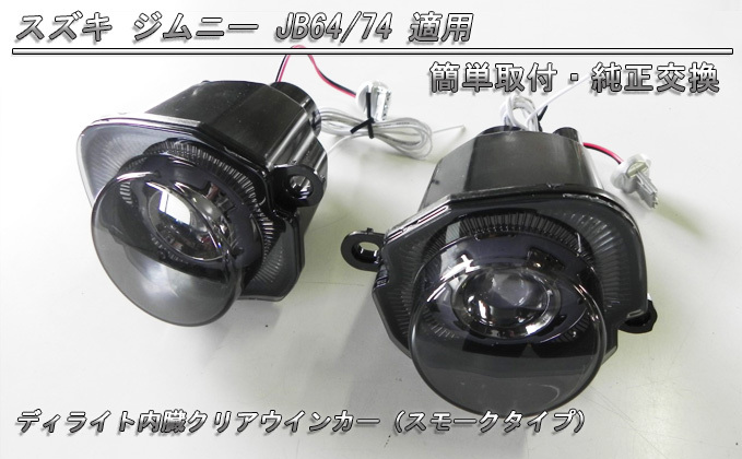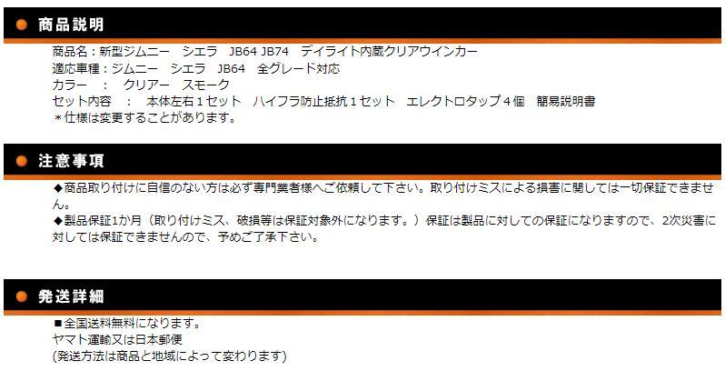 新型ジムニー シエラ JB64 JB74 デイライト内蔵クリアウインカー適応車種:ジムニー シエラ JB64 全グレード対応カラー : クリアー スモークセット内容 : 本体左右1セット ハイフラ防止抵抗1セット エレクトロタップ4個 簡易説明書*仕様は変更することがあります。