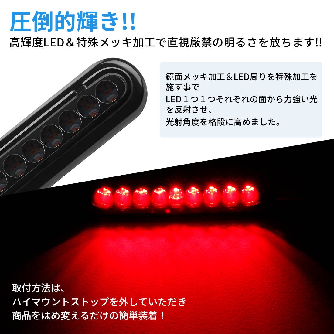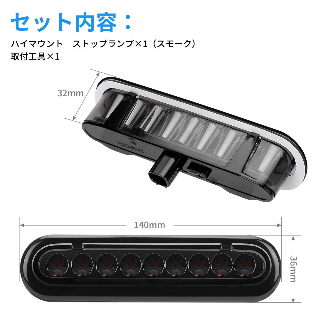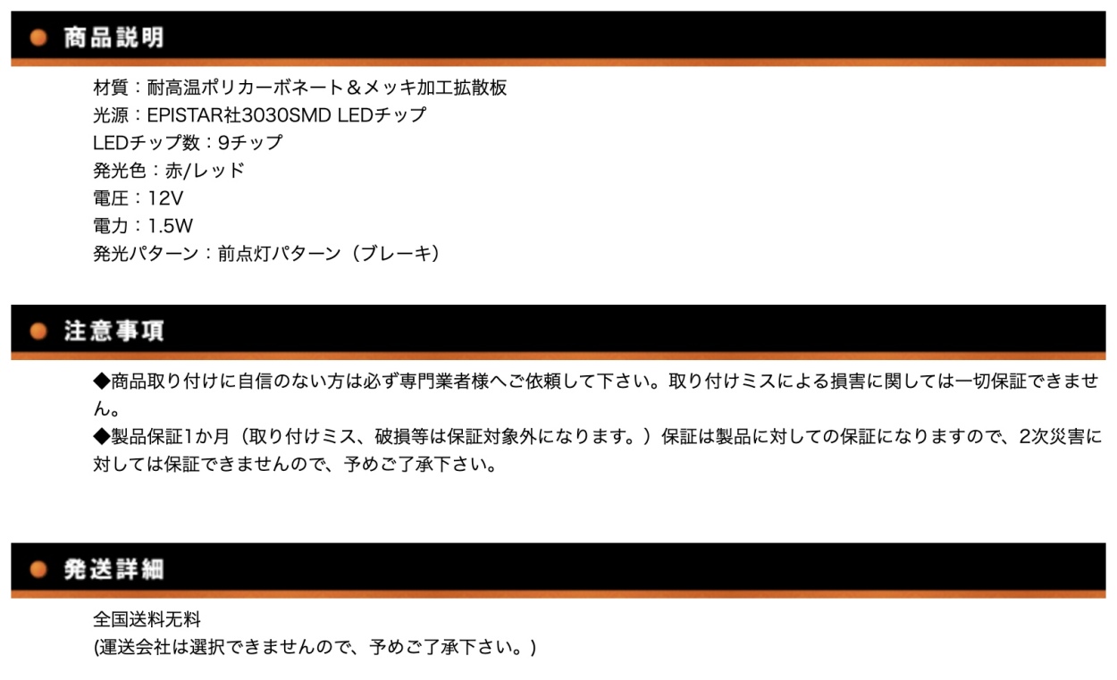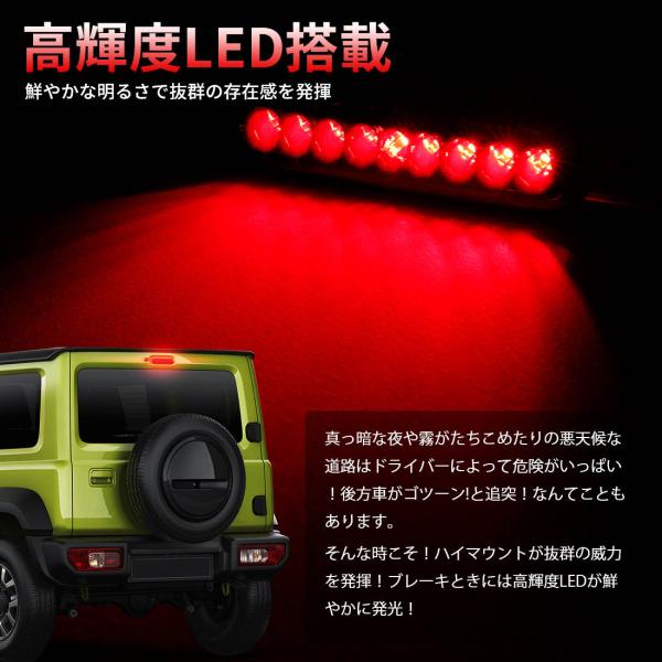 品名:スズキ ジムニーJB64/74 ハイマウント ストップランプ材質:耐高温ポリカーボネート&メッキ加工拡散板光源:EPISTAR社3030SMD LEDチップLEDチップ数:9チップ発光色:赤/レッド電圧:12V電力:1.5W発光パターン:前点灯パターン(ブレーキ)
