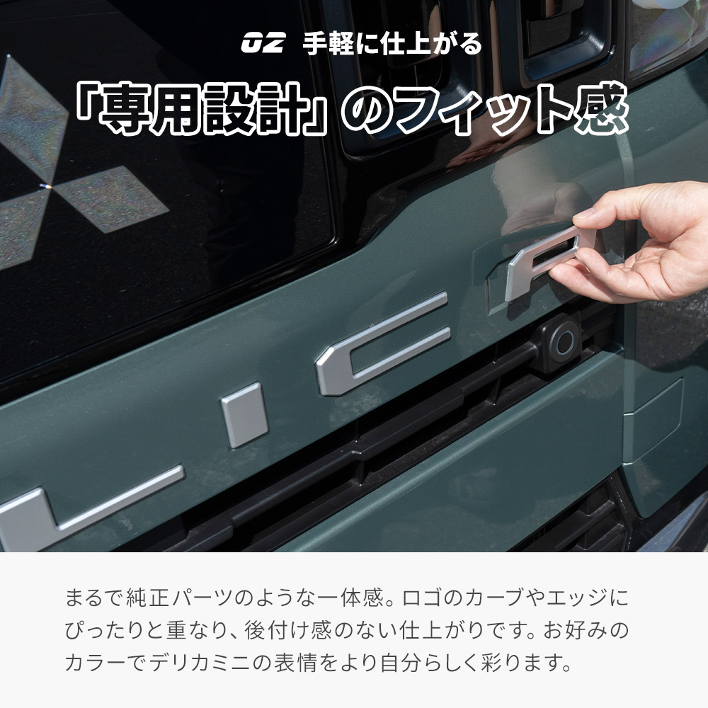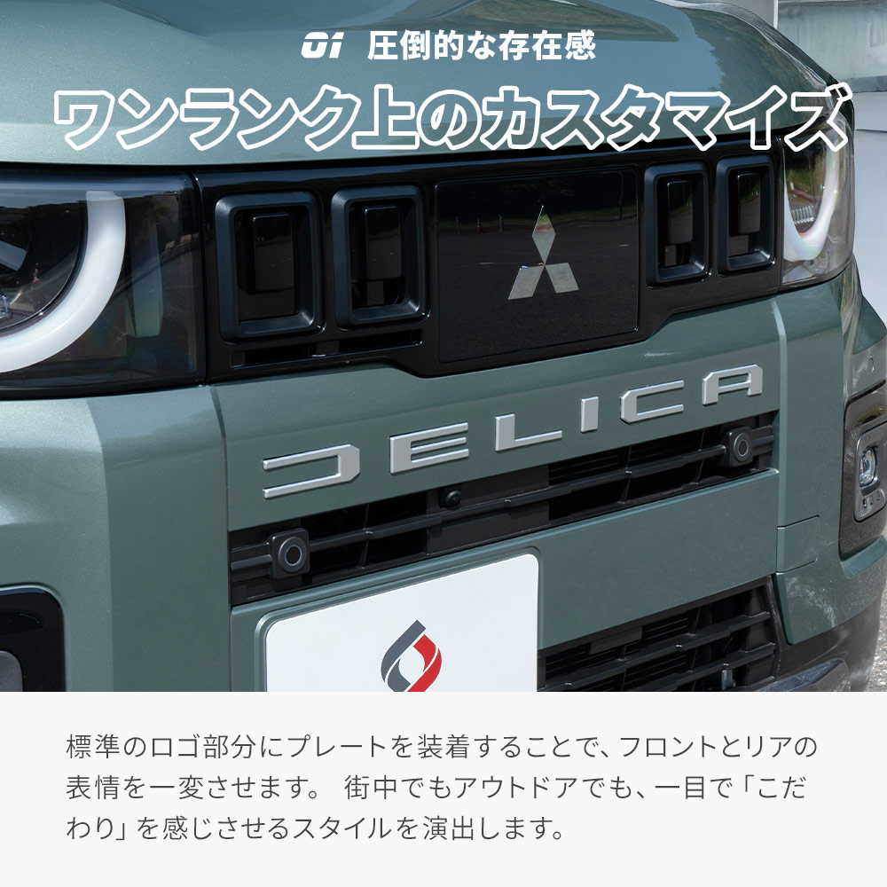 デリカミニ専用に設計されたフロントリアロゴプレートは、2025年式10月の車にぴったりとフィットします。純正パーツのような一体感を持ち、ロゴのカーブやエッジが美しく仕上がっています。後付け感がなく、車の外観を一層引き立てます。お好みのカラーでデリカミニの表情を個性的に彩り、カスタムパーツとしての魅力を引き出します。