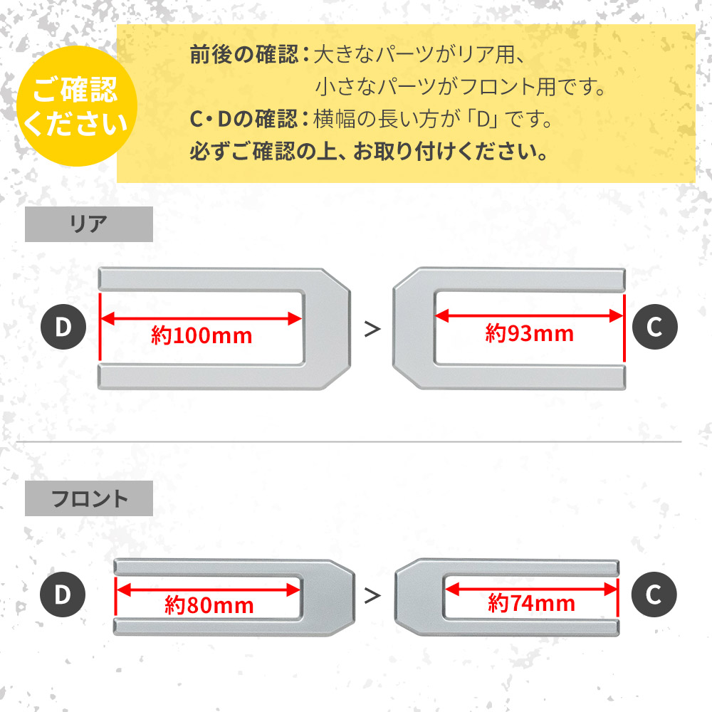 | ※装着する部分は事前に汚れや油分をきれいに取り除いてください。テープを貼り付けた後は、しっかりと押さえ圧着してください。なお、装着後は24時間以上その部分に触れたり、はがしたりしないでください。 ※保護フィルムを剥がされますと、返品不可とさせていただいております。 ※本製品はパーツごとに形状・長さが異なります。貼り間違え防止のため、必ずご確認の上お取り付けください。 ※グレード・追加オプション・エアロパーツ・社外品等を装着している車によっては形状が合わない場合があります。お乗りのお車と商品画像を見比べて合うことをご確認の上、ご購入をお願いいたします。 ※車両適合情報は本製品発売時のものになります。その後の車両側の仕様変更や改修によっては正常に動作/適合しない場合がありますのでご注意ください。 ※取り付けの際の工賃等の請求は一切受け付けません。 ※お取り付けは、自己責任にて、作業を行って下さい。お客様責任による破損での対応は受付できません。 ※必ずフィッティング確認を行ってから取り付けてください。 ※社外品につき小傷等がある場合がございますが、使用に支障がない限り交換、返品はいたしません。 ※本製品を使用したことによる直接、間接的に生じた事故、損害、破損についての責任は弊社は一切負いません。 ※モニターの環境により商品の色合いや素材感などが異なる場合がございます。 ※商品は予告なく仕様変更もしくは販売終了している場合がございますのであらかじめご了承ください。 ※国外への配送はEMSでの発送です。ご注文後、弊社よりメールにて別途送料などをお知らせいたします。 |