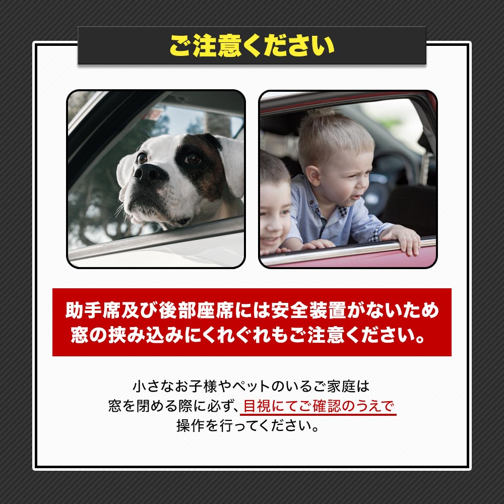 | ※助手席および後部座席の窓には安全装置が付いていませんので挟み込みにはくれぐれもご注意ください。 ※グレード・追加オプション・エアロパーツ・社外品等を装着している車によっては形状が合わない場合があります。お乗りのお車と商品画像を見比べて合うことをご確認の上、ご購入をお願いいたします。 ※車両適合情報は本製品発売時のものになります。その後の車両側の仕様変更や改修によっては正常に動作/適合しない場合がありますのでご注意ください。 ※取り付けの際の工賃等の請求は一切受け付けません。 ※お取り付けは、自己責任にて、作業を行って下さい。お客様責任による破損での対応は受付できません。 ※必ずフィッティング確認を行ってから取り付けてください。 ※社外品につき小傷等がある場合がございますが、使用に支障がない限り交換、返品はいたしません。 ※本製品を使用したことによる直接、間接的に生じた事故、損害、破損についての責任は弊社は一切負いません。 ※モニターの環境により商品の色合いや素材感などが異なる場合がございます。 ※商品は予告なく仕様変更もしくは販売終了している場合がございますのであらかじめご了承ください。 ※国外への配送はEMSでの発送です。ご注文後、弊社よりメールにて別途送料などをお知らせいたします。 |