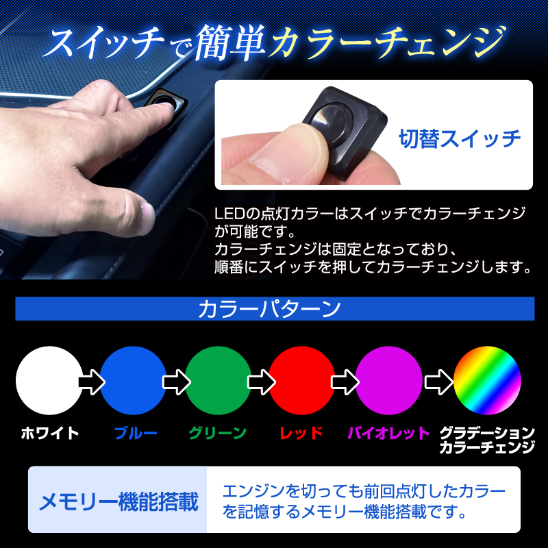 ・スイッチでカラーチェンジが可能です。エンジンを切っても前回点灯したカラーを記憶するメモリー機能付きです。