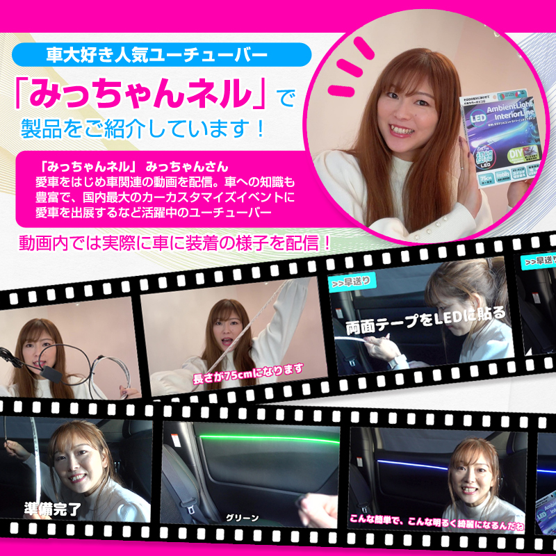 ・薄いので車内の隙間なとに挟み込んで設置いただくことができます。高級車のようなラインイルミネーションの演出をお楽しみいただけます。