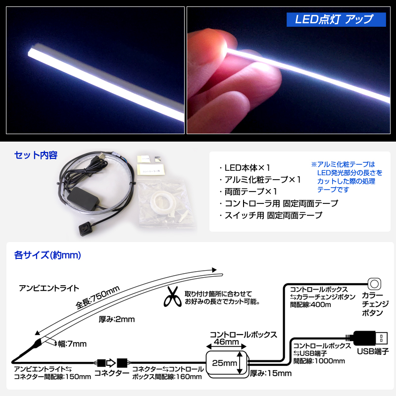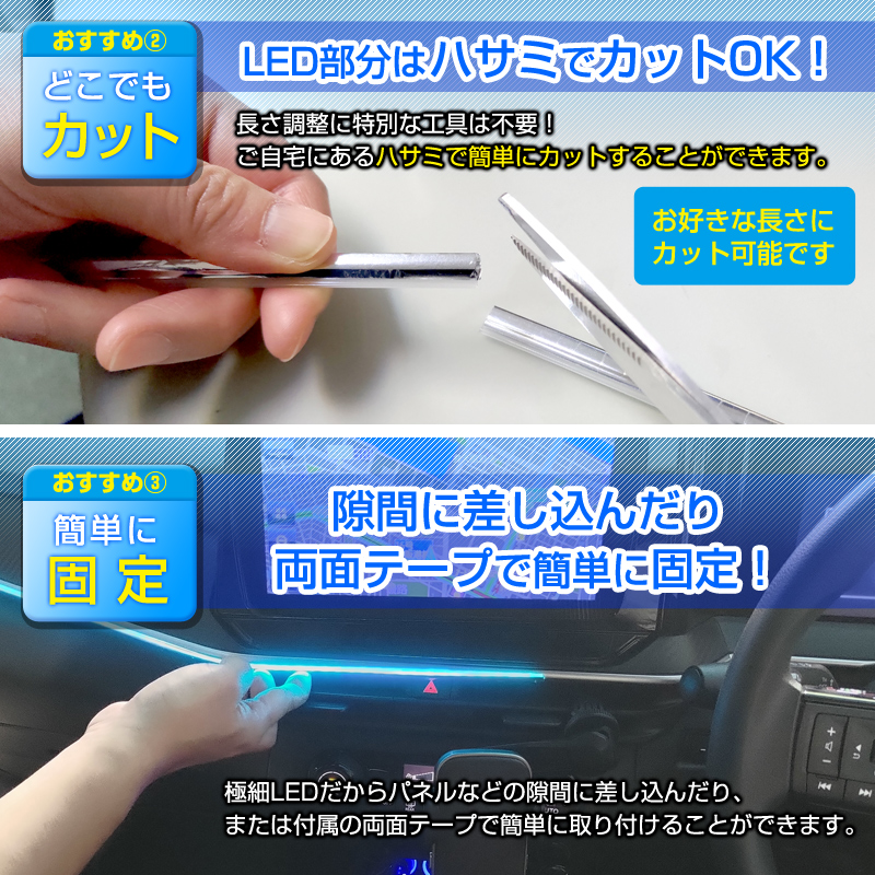 極細LED アンビエントライト インテリアライン 75cm カットOK (1本入) イルミネーションLED 車 内装 ドレスアップ