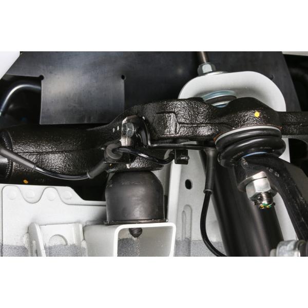 「ストッパーアングルアダプター」の採用によって、ハードダウン状態においてもアッパーアームからの入力をほぼ垂直にキャッチ。車体の浮き上がりが原因で起こる不自然なロールを抑え、安定感のある軽快な走りを実現。