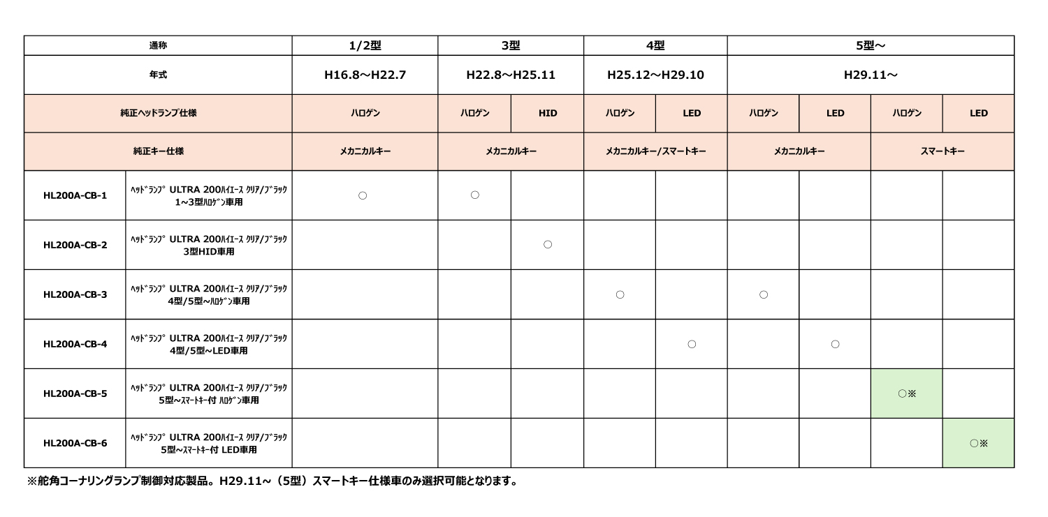 1〜3型から4型へフェイスチェンジには別途、グリル、バンパー等の純正部品が必要となります。※車種によりHL200A-CBに続く品番が異なります
