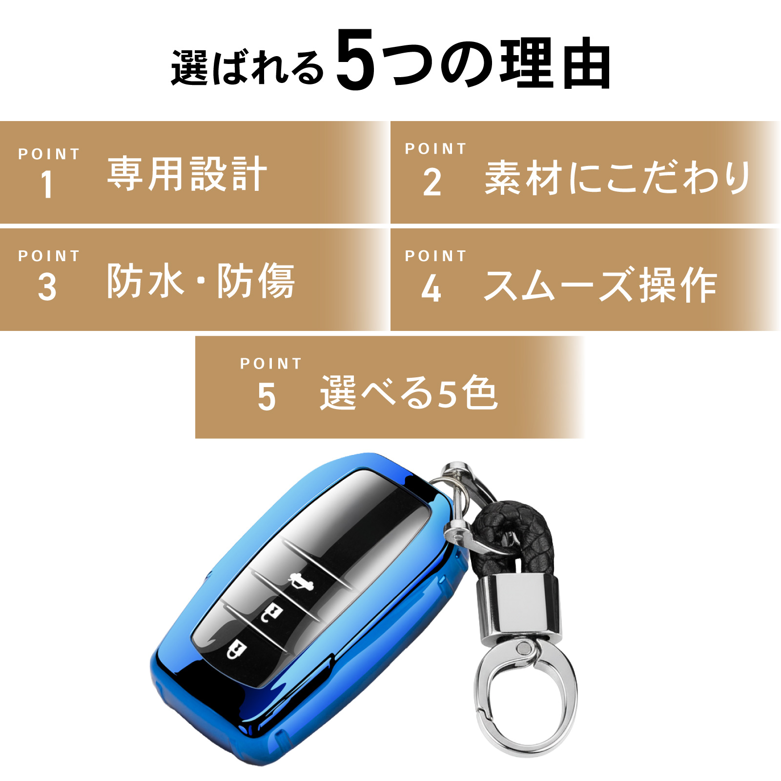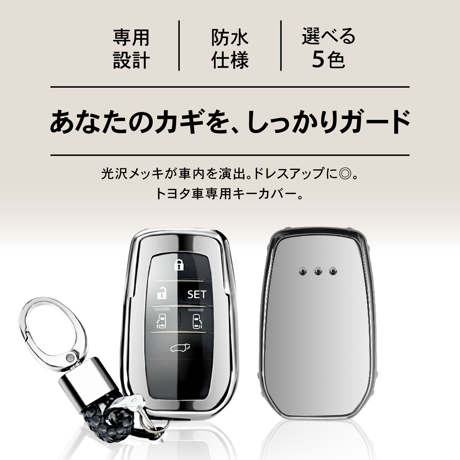 | 商品説明 | あなたのカギを、しっかりガード。 トヨタ車専用、防水仕様。車内を演出キーカバー(typeA) ・POINT.1 「専用設計。」 ・現物採寸、専用設計。 手持ちのカギにぴったりフィット。 全面カバーの、トヨタスマートキーケース。 ・POINT.2 「素材にこだわり。」 ・新感覚のTPU。 硬くて強靭、だけれどしなやか。 こだわり素材で美しく。柔らか強靭キーケース。 [TPUとは?] ・熱可塑性ポリウレタン(Thermoplastic Poly Urethane)の略。ゴムのようにしなやかな弾力性と硬質プラスチックのような強さを合わせ持つ素材で、様々な分野・産業の製品に使用されています。 ・POINT.3 「防水、防傷。」 ・ケース表面には特殊コーティングを実施。 雨、傷、ほこりその他から、あなたのカギを守ります。 ・POINT.4 「スムーズ操作。」 ・TOYOTA車向けの専用設計。 ケースを着けたままでの操作はもちろん、 スマートキーの電波が悪くなることもありません。 ・POINT.5 「選べる5色。」 ・貴方の愛車のアクセサリーにも。 車内に合わせて、気分に合わせて、 光沢メッキが車内を演出。トヨタ車専用キーケース。 ----------------------------------------- (カラーバリエーション) ・シルバー ・ブラックパープル ・レッド ・ブルー ・ピンク ----------------------------------------- 日々の走りを、より美しく。 トヨタ車専用、全面カバー、完全フィット、キーカバー。 (このような商品をお探しのかたに) toyota スマートキーケース キーカバー トヨタ スマートキー ハリアー harrier 80系 RAV4 50系 ヴェルファイア VELLFIRE 30系 アルファード ALPHARD 30系 ヤリス YARIS 210系 10系 ヤリスクロス YARIS CROSS 10系 シエンタ SIENTA 70系 ミライ MIRAI ハイラックス HILIX 120系 マークX MARK X クラウンクロスオーバ スマートキー カバー キーケース カスタム ドレスアップ 鍵 カー用品 カスタマイズ インテリア 選べる 5色 銀 黒紫 赤 青 桃色 シルバー ブラックパープル レッド ブルー ピンク |