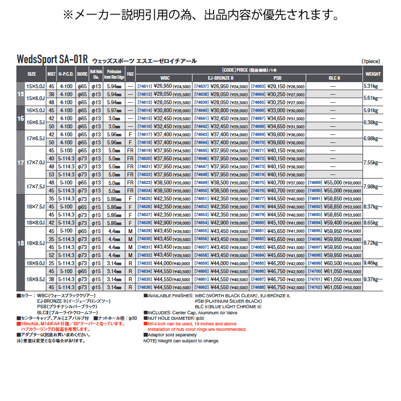 | □出品商品 | | メーカー | ・ | ウェッズ | | 商品名 | ・ | WedsSport SA-01R | | サイズ | ・ | 18×7.5J+45 5H 114.3 φ73 | | カラー | ・ | WBC(ウォースブラッククリアー) | | 品番 | ・ | 0074627 | | 出品本数 | ・ | 4本 |