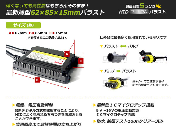 | 高品質9〜16Vデジタルバラスト最新型ICマイクロチップを採用。 最新のデジタル方式を採用した高性能バラストです。 電流・電圧を正確に制御しますので、明るさが安定します。 粗悪品によく見られる改造版バラストではなく、 35W・55Wそれぞれの専用設計のものを採用しております。 |