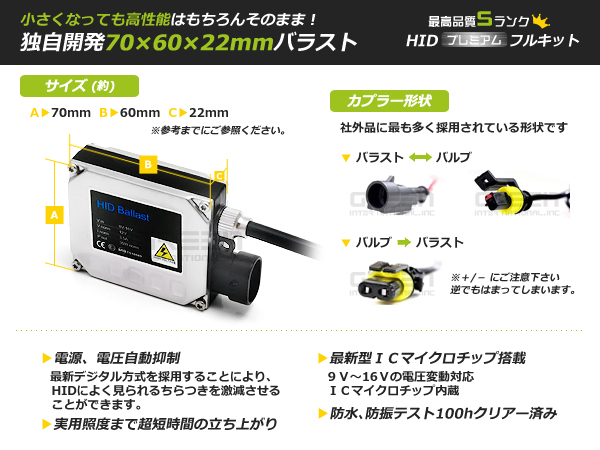 | 高品質9〜16Vデジタルバラスト最新型ICマイクロチップを採用。 最新のデジタル方式を採用した高性能バラストです。 電流・電圧を正確に制御しますので、明るさが安定します。 粗悪品によく見られる改造版バラストではなく、 35W・55Wそれぞれの専用設計のものを採用しております。 |