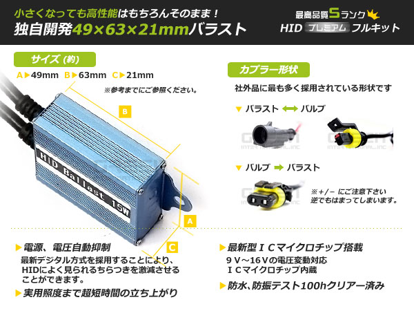 | 高品質9〜16Vデジタルバラスト最新型ICマイクロチップを採用。 最新のデジタル方式を採用した高性能バラストです。 電流・電圧を正確に制御しますので、明るさが安定します。 粗悪品によく見られる改造版バラストではなく、 35W・55Wそれぞれの専用設計のものを採用しております。 |