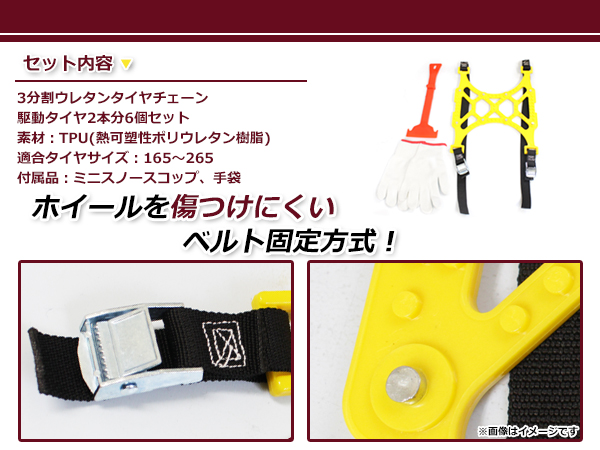 ジャッキアップ不要 タイヤチェーン 非金属 ベルト式 3分割 165mm〜265mm スノーチェーン R14 R15 R16 R17 R18 R19 140/80R 155/80R12