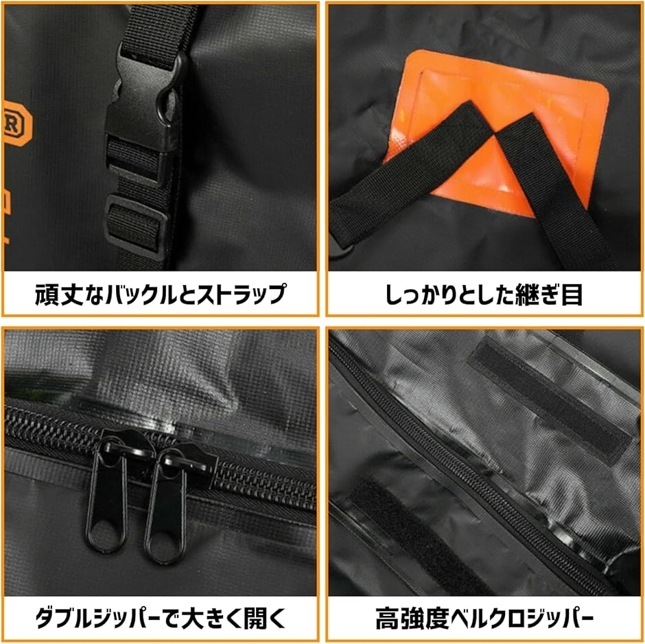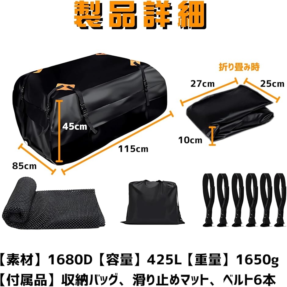 「サイズ」115x85x45cm「折りたたみサイズ」27x25x10cm「素材」1680D「容量」425L「重量」1650g「付属品」収納バッグ、滑り止めマット、ベルト6本